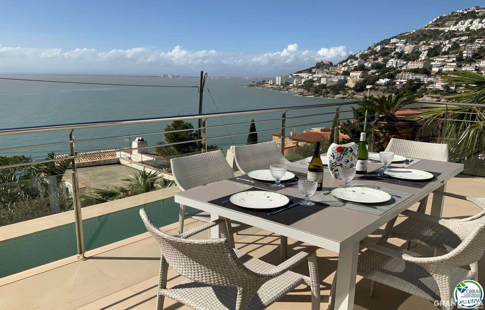 En la privilegiada bahía de Roses se alza esta exclusiva casa de lujo, un refugio de alto standing que combina elegancia, confort y unas vistas al mar absolutamente impresionantes.